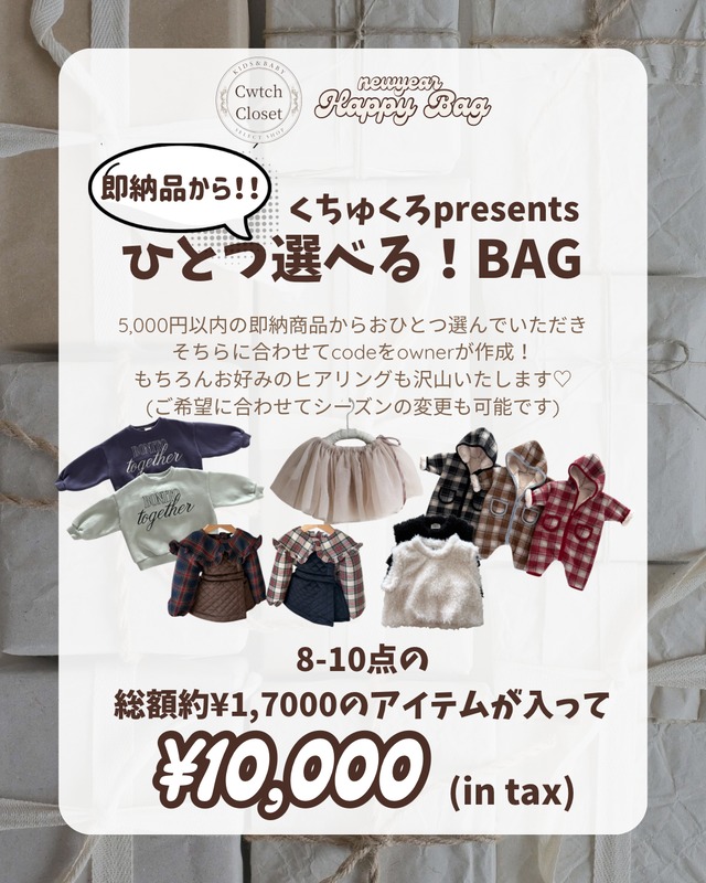 限定10点!!! 秋冬物をメインに 可愛い韓国ブランド子ども服を ぎゅぎゅっ!とお得にお買い物できる Happy Bagをご用意いたしました✴︎ 選べる2種類! 【1つ選べる!BAG】 5,000円以内の即納アイテム1点 お好きなものを選べる!+7-9点 合計約17,000円分8-10点入って… ⇨10,000円!! [payidでご購入の場合送料600円頂戴いたします] ご希望の即納アイテムを、オプションにてご記入いただく形になります♡ どちらも韓国ブランドのお洋服と小物を セレクトしてお作りします。 他アイテムは、お客様のお好みをヒアリングして ownerの似合わせでチョイスします♪ (好きなブランド、今シーズンお買い上げの ブランドやアイテム、好きな雰囲気、 お子様の雰囲気など) 【注意事項】 ※必ずお読みの上ご購入くださいませ ・お届け時期:1月下旬〜2月中旬 (お取り寄せ商品を含む可能性があるため お時間を頂戴いたします。) ・購入に個数制限はございません。 ・ひとつのBAGに、同じカラーののサイズ違いや同じサイズのアイテム違いをご用意することは難しいため、基本的にはお受けしておりません。 ・お取り寄せ商品は今シーズン以前のアイテムが 入る可能性がございます。 (独自の特別な仕入れ先よりご用意いたします。 今は手に入りにくいアイテムがgetできるかも?!) ※海外輸入服は日本のサイズ感とは異なるもの、 裁縫が粗いもの、タグが無い等がございます。 また、納品書は同封しておりません。 ※ご購入前には shopping guideを必ずお読みください。 https://cwtchcloset.base.shop/about ※ギフトラッピングについて 別途200円(税込)にてラッピングを承っております。 下記選択ボックスよりギフトラッピングを選んでください。 詳細はこちらをご覧ください。 https://cwtchcloset.base.shop/items/75055097
